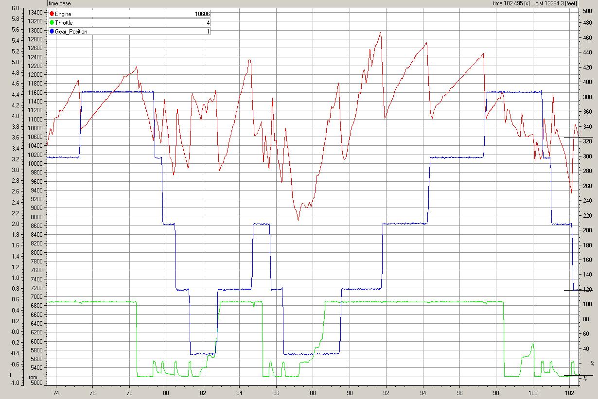 - A sample data log from an RFR1000 car using the Geartronics paddleshift system. Note the seamless RPM transitions (red) between each gear and the perfect gear engagement (blue). Downshift throttle blips can be clearly seen in green. All inputs were sampled at 200Hz.
