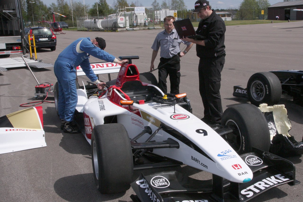 - Geartronics Director Neil Wallace with Patrick Lane-Knott setting up the Honda BAR F1 car for Rajamaki Racing in Sweden.