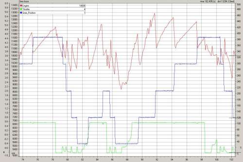 - A sample data log from an RFR1000 car using the Geartronics paddleshift system. Note the seamless RPM transitions (red) between each gear and the perfect gear engagement (blue). Downshift throttle blips can be clearly seen in green. All inputs were sampled at 200Hz.