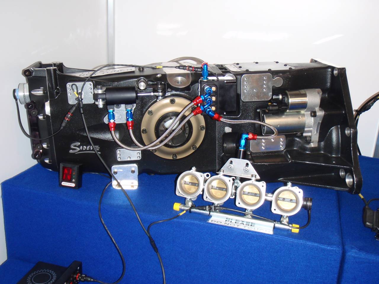 The second trip was a bit closer to home, with a visit to Mansell Motorsport to setup their 1997 Jordan EJ197. This car has been fitted with a JUDD GV4 V10 engine but still retains the original Jordan gearbox. The gearbox is a 7-speed unit, but with neutral lying between 1st & 2nd. Mansell's outfit have previously used a well-respected rival system, but when it was discovered that it wasn't capable of making the 1/2 shift to neutral, we were asked to supply our GCU and control valves. With the help of Barry Smith from Engine Developments on the EFi engine ECU, we quickly had the car up and running. It's very rewarding to work with such machines, and we would like to thank Kevin & Scott Mansell for giving us the opportunity to help with their car. We're sure it won't be the last time...
